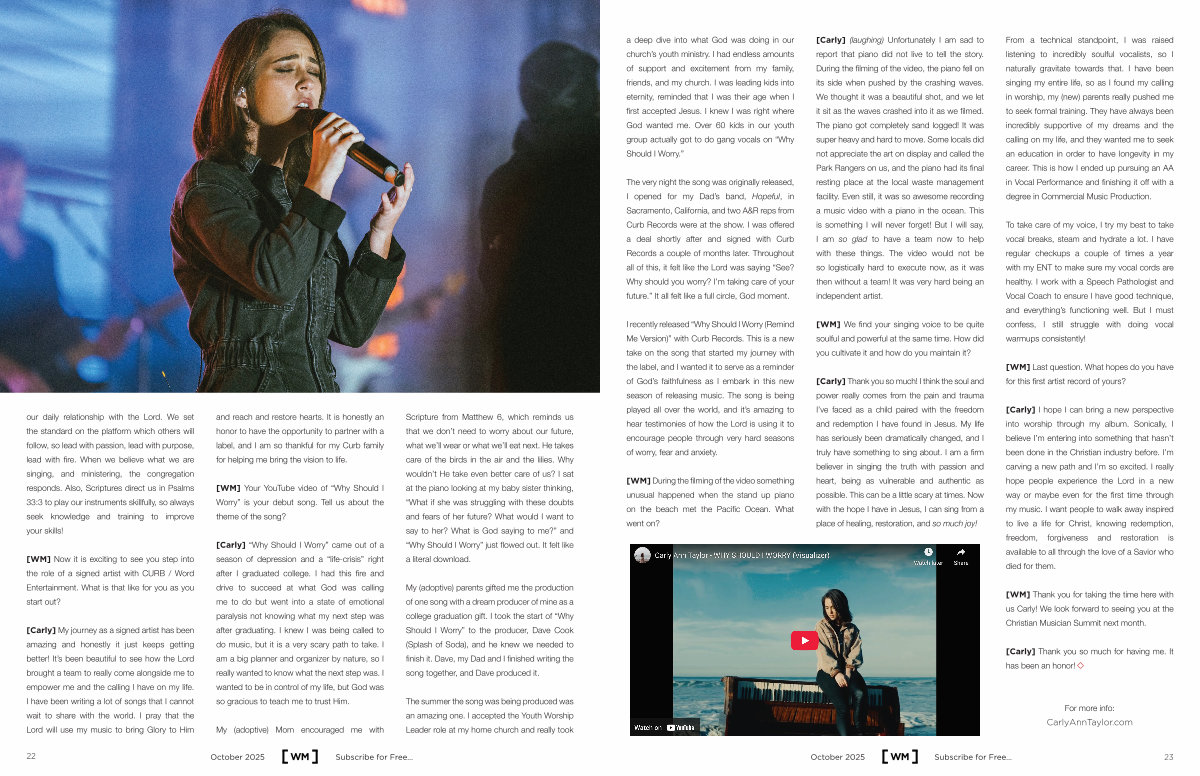 [ WM ] Thank you for taking the time here with us Carly! We look forward to seeing you at the Christian Musician Summit next month. [ Carly ] Thank you so much for having me. It has been an honor!