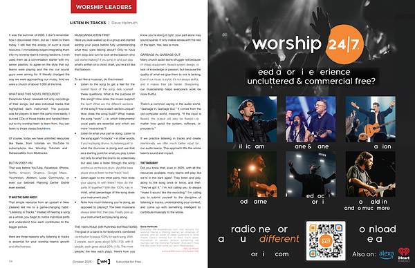 THE TAKEAWAY Did you know that, even in 2025, with all the resources available, many teams still play like we’ re in the dark ages? They listen and play along to the song once or twice, and then“ they’ ve got it.” I’ m not calling you to always“ make it sound like the recording.” I’ m calling you to submit yourself to the discipline of listening in tracks, understanding your context, and come up with something intelligent to contribute musically to the whole.