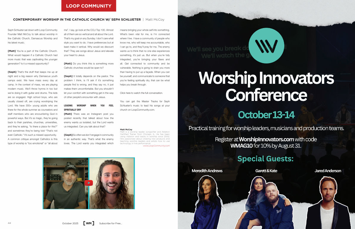 Matt McCoy Matt is a worship leader, songwriter and Ableton Certified Trainer from Chicago, IL. He has been using Ableton and tracks in worship since 2002. He’ s passionate about creating new products and teaching worship leaders and artists how to use technology in live performance. www. LoopCommunity. com 44 October 2025 Subscribe for Free...