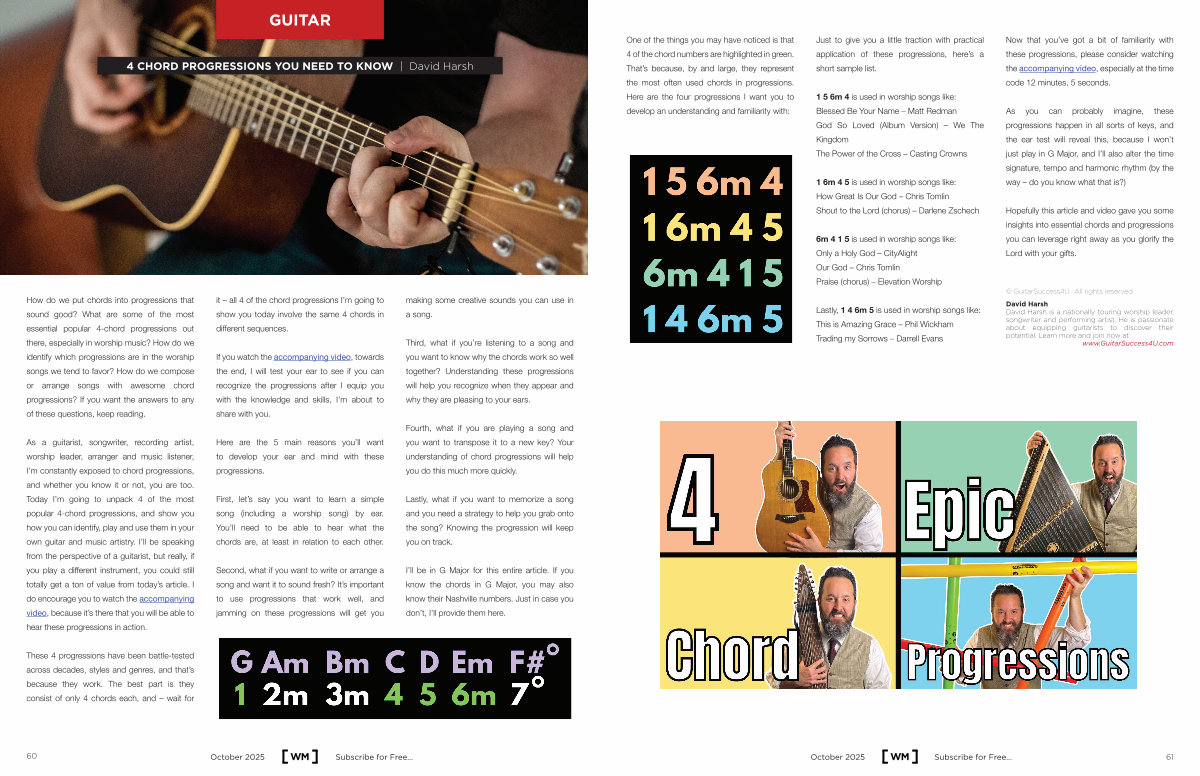 As a guitarist, songwriter, recording artist, worship leader, arranger and music listener, I’ m constantly exposed to chord progressions, and whether you know it or not, you are too. Today I’ m going to unpack 4 of the most popular 4-chord progressions, and show you how you can identify, play and use them in your own guitar and music artistry. I’ ll be speaking from the perspective of a guitarist, but really, if you play a different instrument, you could still totally get a ton of value from today’ s article. I do encourage you to watch the accompanying video, because it’ s there that you will be able to hear these progressions in action.