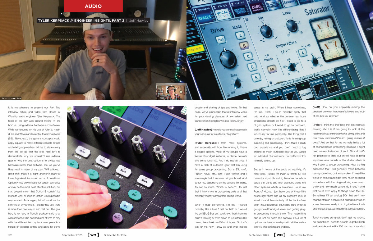 [ Tyler ] I think the first thing that I’ m normally thinking about is if I’ m going to look at the hardware: how expensive is this going to be and how many versions of this am I going to need at once? And so that for me normally limits a lot of channel-based processing because I might need several instances of an 1176 and that’ s not practical to bring out on the road or bring anywhere else outside of the studio, which is why I stick to group processing. Now the big distinction that I will generally make between having something on the console or if I need like a plug-in on a Waves rig is‘ how much do I need to interface with that plug-in during a service or show and how much control do I need?’ And that could even apply to things down the EQ. Sometimes I’ ll set analog EQs that are in my channel strip on a server, but during a service or show, I’ m never really touching it— I’ m actually on the desk because I need that tactical control.