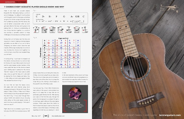 I’ ve borrowed Fig. 2 from Mitch Bohannon’ s capo article in this issue to demonstrate how easy it is to apply this to keys that are not particularly guitar friendly like Db. After placing your capo at the third fret, play through the same chord progression you played through a moment ago, again calling out the scale degree numbers. What’ s great about this method is that it makes if very easy to see how the chords relate to one another based on the Major scale, regardless of what key your playing in – amen