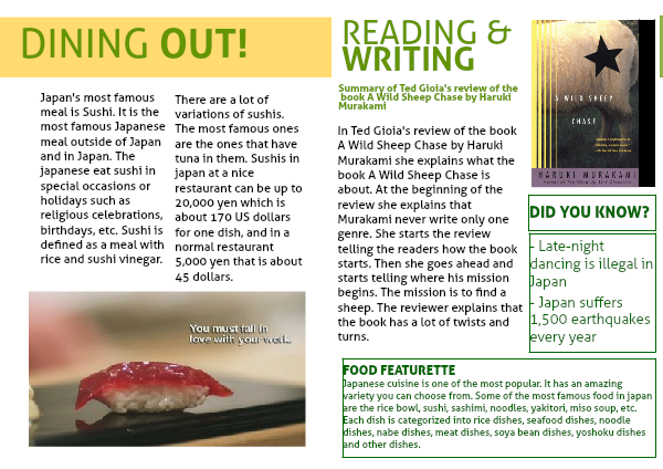 Japan's most famous meal is Sushi. It is the most famous Japanese meal outside of Japan and in Japan. The japanese eat sushi in special occasions or holidays such as religious celebrations, birthdays, etc. Sushi is defined as a meal with rice and sushi vinegar.
