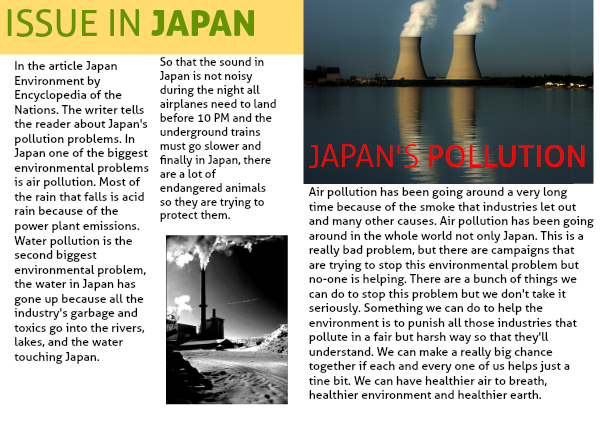 In the article Japan Environment by Encyclopedia of the Nations. The writer tells the reader about Japan's pollution problems. In Japan one of the biggest environmental problems is air pollution. Most of the rain that falls is acid rain because of the power plant emissions. Water pollution is the second biggest environmental problem, the water in Japan has gone up because all the industry's garbage and toxics go into the rivers, lakes, and the water touching Japan.