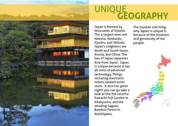 Japan is formed by thousands of islands. The 4 largest ones are Honshu, Hokkaido, Kyushu, and Shikoku. Japan's neighbors are North and South Korea, Russia, and China. The Sea of Japan separates Asia from Japan. Japan is unique because it has all sorts of advanced technology. Things including electronic toilets, heated toilet seats. It also has great sights you can go take a look at like the colorful Kawachi Fuji Garden in Kitakyushu, and the amazing Sagano Bamboo Forest in Arashiyama.