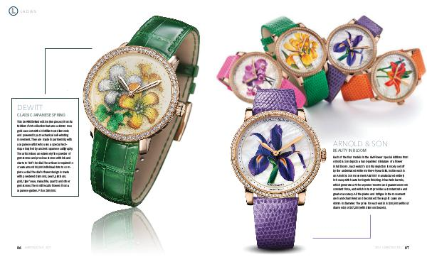Each of the four models in the HM Flower Special Editions from Arnold & Son depicts a hand-painted miniature of a flower in full bloom. Each watch’ s colorful depiction is nicely set off by the understated white mother-of-pearl dial. Inside each is an Arnold & Son movement A & S1001 manufactured entirely in-house, with haute horlogerie finishing. It has twin barrels, which generate a 90-hour power reserve and guarantees more constant force, and which in turn provides a constant rate and greater accuracy. All the plates and bridges in the movement are hand-chamfered and decorated. These gold cases are 40mm in diameter. The price for each watch is $ 30,500( without diamonds) or $ 37,250( with diamond bezels).