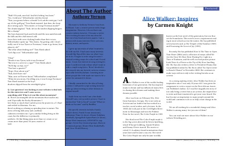 As a young aspiring writer, Alice Walker has been an inspiration since I was only 10 years old. I was given the assignment to write a report on the First African American Published Author. As I read her magnificent story of not only being a writer but as an activist, she inspired me to write and that it mattered to get your voice heard. She has become an inspiration to many people around the world and continues to do so to help create change in the world.