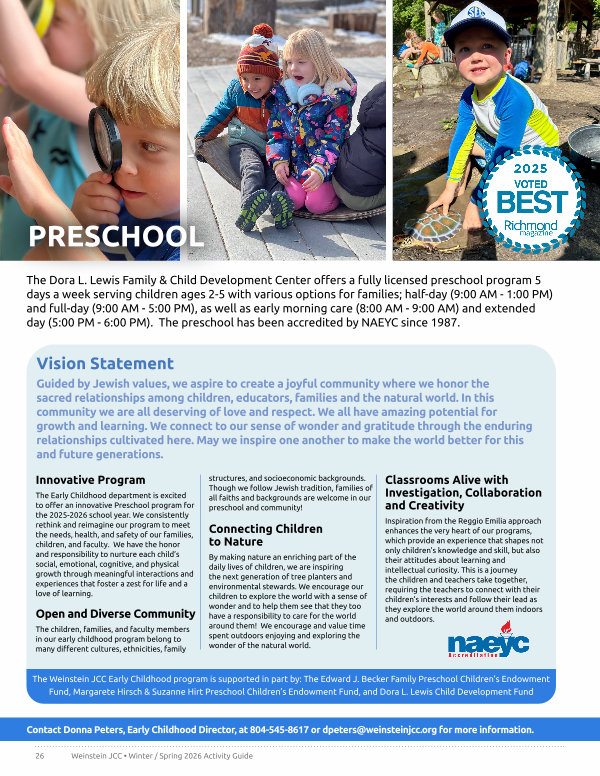 Contact Donna Peters, Early Childhood Director, at 804-545-8617 or dpeters @ weinsteinjcc. org for more information.