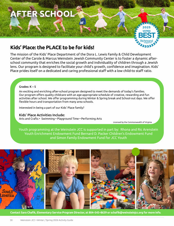 Contact Sara Chafik, Elementary Service Program Director, at 804 – 545 – 8639 or schafik @ weinsteinjcc. org for more info.