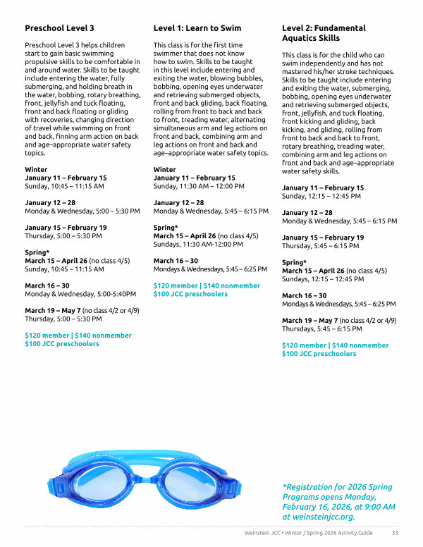 * Registration for 2026 Spring Programs opens Monday, February 16, 2026, at 9:00 AM at weinsteinjcc. org.