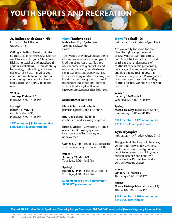 Contact Nick Pruden, Youth Sports and Specialty Camps Director, at 804-545-8611 or npruden @ weinsteinjcc. org for more info.