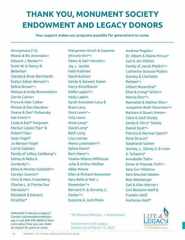 * Of Blessed Memory + Endowment Endowment and Legacy Donors as of November 2022 60 Weinstein JCC • Winter / Spring 2026 Activity Guide