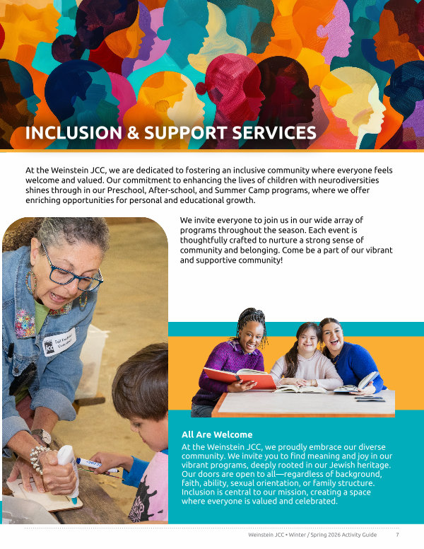 At the Weinstein JCC, we proudly embrace our diverse community. We invite you to find meaning and joy in our vibrant programs, deeply rooted in our Jewish heritage. Our doors are open to all— regardless of background, faith, ability, sexual orientation, or family structure. Inclusion is central to our mission, creating a space where everyone is valued and celebrated.