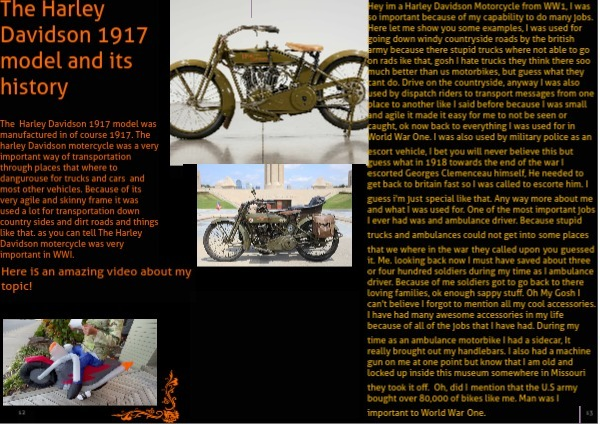 Hey im a Harley Davidson Motorcycle from WW1, I was so important because of my capability to do many jobs. Here let me show you some examples, I was used for going down windy countryside roads by the british army because there stupid trucks where not able to go on rads ike that, gosh I hate trucks they think there soo much better than us motorbikes, but guess what they cant do. Drive on the countryside, anyway I was also used by dispatch riders to transport messages from one place to another like I said before because I was small and agile it made it easy for me to not be seen or caught, ok now back to everything I was used for in World War One. I was also used by military police as an escort vehicle, I bet you will never believe this but guess what in 1918 towards the end of the war I escorted Georges Clemenceau himself, He needed to get back to britain fast so I was called to escorte him. I guess i'm just special like that. Any way more about me and what I was used for. One of the most important jobs I ever had was and ambulance driver. Because stupid trucks and ambulances could not get into some places that we where in the war they called upon you guessed it. Me. looking back now I must have saved about three or four hundred soldiers during my time as I ambulance driver. Because of me soldiers got to go back to there loving families, ok enough sappy stuff. Oh My Gosh I can't believe I forgot to mention all my cool accessories. I have had many awesome accessories in my life because of all of the jobs that I have had. During my time as an ambulance motorbike I had a sidecar, It really brought out my handlebars. I also had a machine gun on me at one point but know that I am old and locked up inside this museum somewhere in Missouri they took it off. Oh, did I mention that the U.S army bought over 80,000 of bikes like me. Man was I important to World War One.