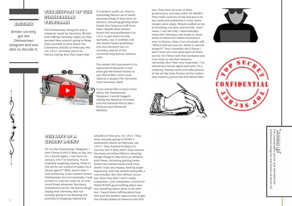 war. They sent me over to their government, and they were SO ANGRY! They took a picture of me and put it on the news and published it. Even more people were angry. People looked at me as shocking, terrible, and horrific. And I mean, I can see why. I was basically news that Germany was ready to steal some of America’s states and hand it over to Mexico. Now, a lot of people ask, “Which side are you on: allies or central powers?” And I honestly don’t know. I don’t have any clue what each of them are for. All I know was that Germany was a lot nicer to me than America, obviously. But I feel very important. I’ve retired as a secret agent and now I’m a celebrity. People come and take photos of me all the time, known as the reason why America joined the first World War.
