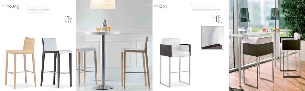 Sgabello Young nelle versioni rovere sbiancato e tinto wengé con seduta e schienale imbottiti, rivestiti in tessuto, vera