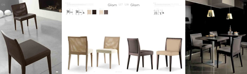 Sedia Glam con sedile e schienale imbottiti rivestiti in tessuto, vera o finta pelle.