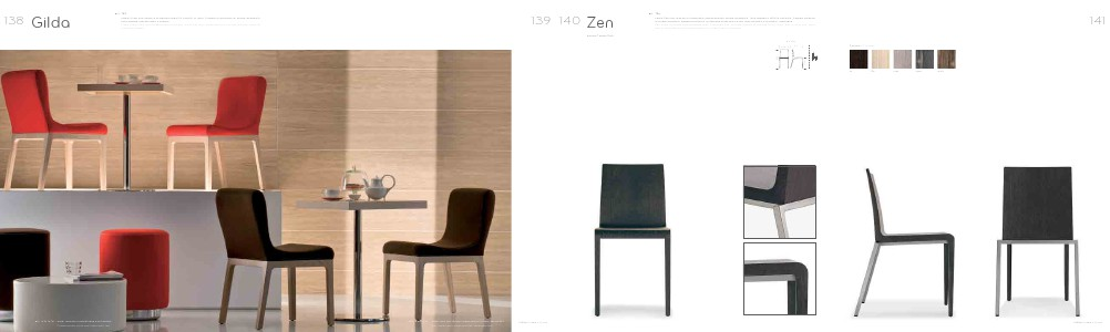 in rovere massello; gambe posteriori in tubolare d’acciaio 20x20 mm satinato o cromato. Impilabile.