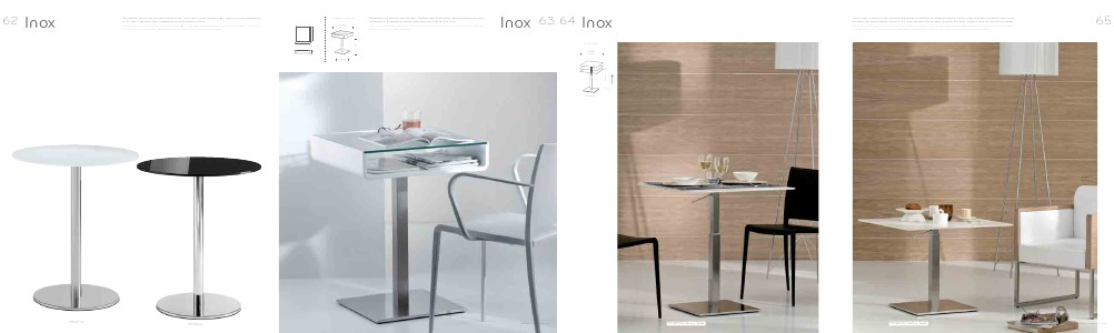 Inox table, brushed stainless steel, adjustable in height with gas lift device with lever on the column; from dining table