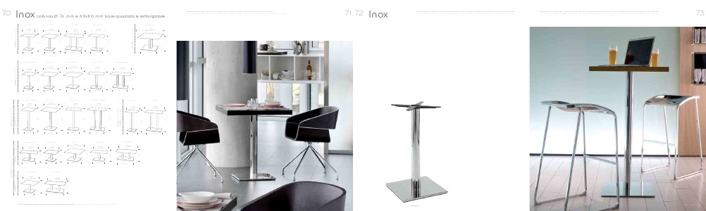 Square Inox table base, polished stainless steel with Ø 76 mm column; available in brushed stainless steel.