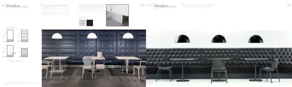 Modus lineare altezza 240 cm con rivestimento in finta pelle; sedili con bottoni e cuciture orizzontali.