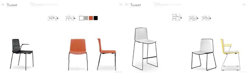 Tweet sedia e poltrona con telaio a slitta in tondino d’acciaio Ø 11 mm sono impilabili.