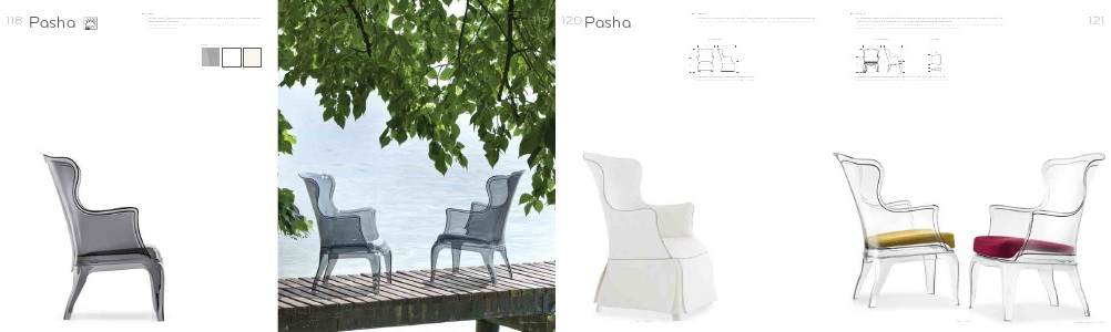 La poltrona Pasha in policarbonato trasparente, fumè e bianco si inserisce anche