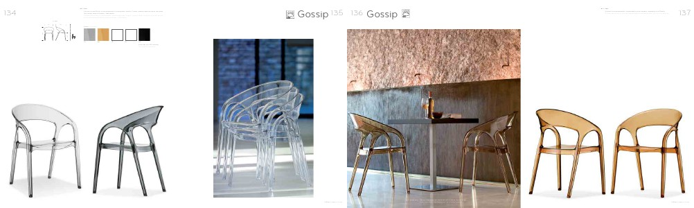 Gossip è realizzata in policarbonato trasparente neutro, fumè, ambra oppure nella versione