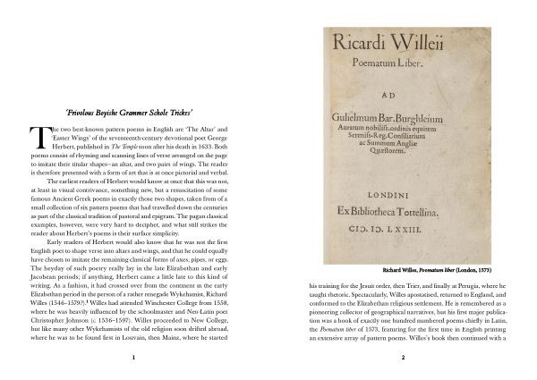 his training for the Jesuit order , then Trier , and finally at Perugia , where he taught rhetoric . Spectacularly , Willes apostatised , returned to England , and conformed to the Elizabethan religious settlement . He is remembered as a pioneering collector of geographical narratives , but his first major publication was a book of exactly one hundred numbered poems chiefly in Latin , the Poematum liber of 1573 , featuring for the first time in English printing an extensive array of pattern poems . Willes ’ s book then continued with a
