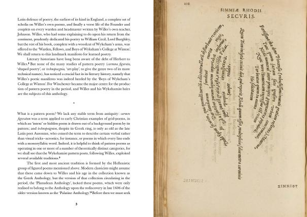 Literary historians have long been aware of the debt of Herbert to Willes . 2 But none of the many studies of pattern poetry ( carmina figurata , ‘ shaped poetry ’, or technopaegnia , ‘ art-play ’, to give the genre two of its more technical names ), has noticed a crucial fact in its literary history , namely that Willes ’ s poetic manifesto was indeed heeded by the ‘ Boys of Wykeham ’ s College at Winton ’. For Winchester became the major centre for the production of pattern poetry in the period , and Willes and his Wykehamist heirs are the subjects of this anthology .