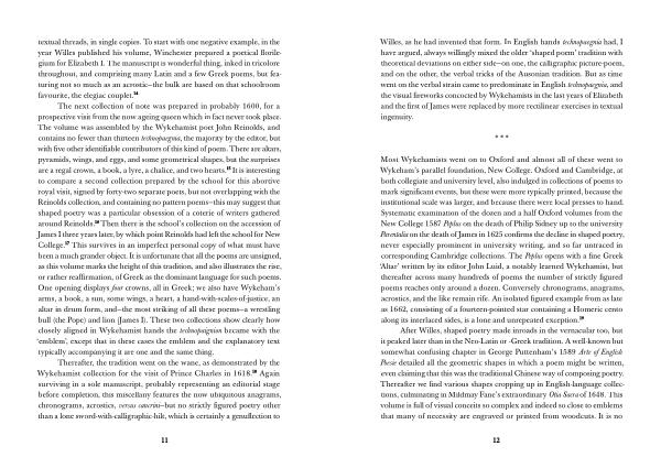 The next collection of note was prepared in probably 1600 , for a prospective visit from the now ageing queen which in fact never took place . The volume was assembled by the Wykehamist poet John Reinolds , and contains no fewer than thirteen technopaegnia , the majority by the editor , but with five other identifiable contributors of this kind of poem . There are altars , pyramids , wings , and eggs , and some geometrical shapes , but the surprises are a regal crown , a book , a lyre , a chalice , and two hearts . 15 It is interesting to compare a second collection prepared by the school for this abortive royal visit , signed by forty-two separate poets , but not overlapping with the Reinolds collection , and containing no pattern poems — this may suggest that shaped poetry was a particular obsession of a coterie of writers gathered around Reinolds . 16 Then there is the school ’ s collection on the accession of James I three years later , by which point Reinolds had left the school for New College . 17 This survives in an imperfect personal copy of what must have been a much grander object . It is unfortunate that all the poems are unsigned , as this volume marks the height of this tradition , and also illustrates the rise , or rather reaffirmation , of Greek as the dominant language for such poems . One opening displays four crowns , all in Greek ; we also have Wykeham ’ s arms , a book , a sun , some wings , a heart , a hand-with-scales-of-justice , an altar in drum form , and — the most striking of all these poems — a wrestling bull ( the Pope ) and lion ( James I ). These two collections show clearly how closely aligned in Wykehamist hands the technopaignion became with the ‘ emblem ’, except that in these cases the emblem and the explanatory text typically accompanying it are one and the same thing .