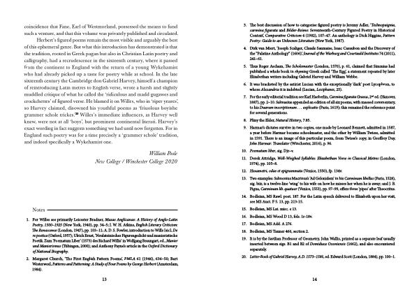 1 . For Willes see primarily Leicester Bradner , Musae Anglicanae : A History of Anglo-Latin Poetry , 1500 – 1925 ( New York , 1940 ), pp . 34 – 5 ; J . W . H . Atkins , English Literary Criticism : The Renascence ( London , 1947 ), pp . 103 – 11 ; A . D . S . Fowler , introduction to Wills [ sic ], De re poetica ( Oxford , 1957 ); Ulrich Ernst , ‘ Neulateinisches Figurengedicht und manieristische Poetik . Zum ‘ Poematum Liber ’ ( 1573 ) des Richard Willis ’ in Wolfgang Braungart , ed ., Manier und Manierismus ( Tübingen , 2000 ); and Anthony Payne ’ s article in the Oxford Dictionary of National Biography .