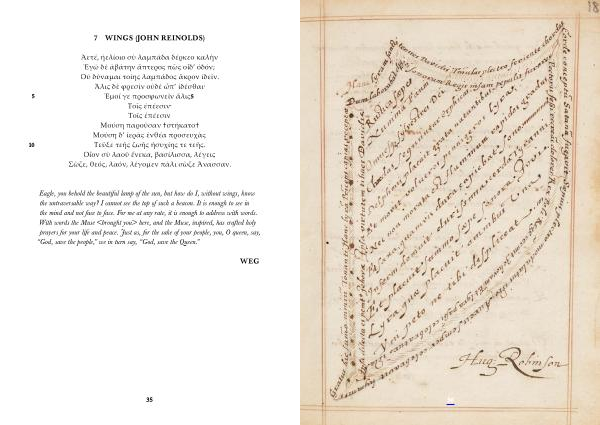 Ἀετέ , ἠελίοιο σὺ λαμπάδα δέρκεο καλὴν Ἐγὼ δὲ ἀβάτην ἄπτερος πῶς οἶδ ’ ὁδόν ; Οὐ δύναμαι τοίης λαμπάδος ἄκρον ἰδεῖν . Ἅλις δὲ φρεσὶν οὐδὲ ὦπ ’ ἰδέσθαι · Ἐμοί γε προσφωνεῖν ἅλις5 Τοῖς ἐπέεσιν · Τοῖς ἐπέεσιν Μούση παροῦσαν † στήκατο † Μούση δ ’ ἱερὰς ἐνθέα προσευχὰς Τεῦξε τεῆς ζωῆς ἡσυχίης τε τεῆς . Οἵον σὺ λαοῦ ἕνεκα , βασίλισσα , λέγεις Σῶζε , θεός , λαόν , λέγομεν πάλι σῶζε Ἄνασσαν .