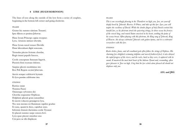 STRINGS Rustica saepe Numina Fauni Omnesque sylvestres dei Chordas sequuntur Orphicas . Delphinis placuit grata natantibus Et movit volucres pennigeros lyra , Nec non morata est fluminum rapidos gradus Et saxa , quamvis dura , capiebat sono . Informis domuit durissima corda Tyranni Et placuit summo saepe sonora Iovi . Lyra quae placuit omnibus una Uni peto ne tibi displiceat .