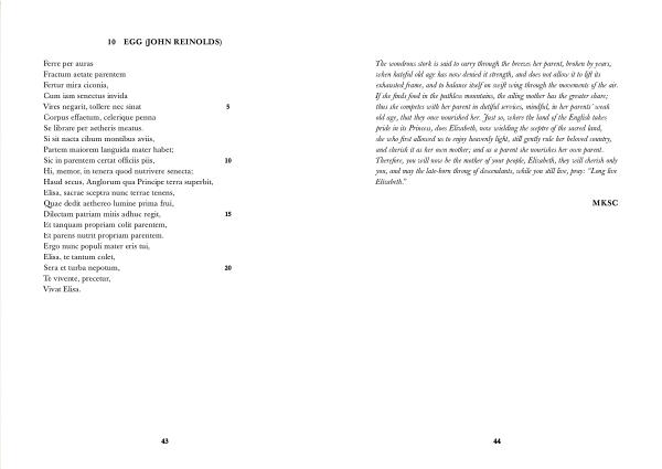 The wondrous stork is said to carry through the breezes her parent , broken by years , when hateful old age has now denied it strength , and does not allow it to lift its exhausted frame , and to balance itself on swift wing through the movements of the air . If she finds food in the pathless mountains , the ailing mother has the greater share ; thus she competes with her parent in dutiful services , mindful , in her parents ’ weak old age , that they once nourished her . Just so , where the land of the English takes pride in its Princess , does Elizabeth , now wielding the sceptre of the sacred land , she who first allowed us to enjoy heavenly light , still gently rule her beloved country , and cherish it as her own mother ; and as a parent she nourishes her own parent . Therefore , you will now be the mother of your people , Elizabeth , they will cherish only you , and may the late-born throng of descendants , while you still live , pray : “ Long live Elizabeth .”