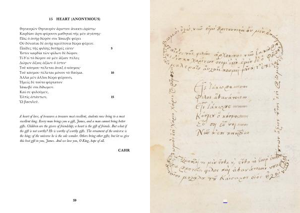 θησαυρῶν θησαυρὸν ἄριστον ἄνακτι ἀρίστῳ Καρδίαν ἄρτι φέρουσι μαθηταὶ τῆς μὲν ἀγάπης · Πᾶς ὁ ἀνὴρ δῶρόν σοι Ἰάκωβε φέρει Οὐ δύναται δὲ ἀνὴρ κρείττονα δῶρα φέρειν . Παῖδες τῆς φιλίης δοτῆρές εἰσιν · 5 Ἔστιν καρδία τῶν φίλων δὲ δῶρον . Τί δ ’ εἰ τὸ δῶρον οὐ μὲν ἄξιον πέλει ; Δώρων ἄξιος ἀξίων ὅ ἐστιν · Τοῦ κόσμου πέλεται ἄναξ ὁ κόσμος · Τοῦ κόσμου πέλεται μόνον τὸ θαῦμα . 10 Ἄλλα μὲν ἄλλοι δῶρα φέρουσι , Ἡμεῖς δὲ τοῦτο φέρτατον Ἰάκωβέ σοι δίδωμεν . Καί σε φιλοῦμεν , Ἐλπὶς ἁπάντων , 15 ῏Ω βασιλεῦ .