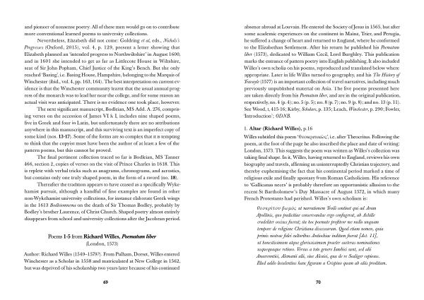 absence abroad at Louvain . He entered the Society of Jesus in 1565 , but after some academic experiences on the continent in Mainz , Trier , and Perugia , he suffered a change of heart and returned to England , where he conformed to the Elizabethan Settlement . After his return he published his Poematum liber ( 1573 ), dedicated to William Cecil , Lord Burghley . This publication marks the entrance of pattern poetry into English publishing . It also included Willes ’ s own scholia on his poems , reproduced and translated below where appropriate . Later in life Willes turned to geography , and his The History of Travayle ( 1577 ) is an important collection of travel narratives , including much previously unpublished material on Asia . The five poems presented here are taken directly from his Poematum liber , and are in the original publication , respectively , no . 4 ( p . 4 ); no . 5 ( p . 5 ); no . 8 ( p . 7 ); no . 9 ( p . 8 ); and no . 13 ( p . 11 ). See Wood , i , 415-16 ; Kirby , Scholars , p . 135 ; Leach , Winchester , p . 290 ; Fowler , ‘ Introduction ’; ODNB .