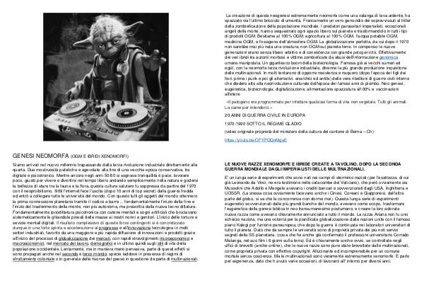 La creazione di questa neogenesi estremamente neomorfa come una valanga di lava ardente, ha spazzato via l ' ultimo bricciolo di umanità. Francamente un vero genocidio dei sopravvissuti al triller della zombieficazione della popolazione mondiale. I predatori parassitari imperialisti, eccezionali angeli della morte, hanno sequestrato ogni spazio libero sul pianeta e trasformandolo in tutti i tipi di prodotti OGM. Bestiame al 100 % OGM, agricoltura al 100 % OGM, l ' acqua potabile OGM, medicina OGM, e l ' ossigeno dell ' atmosfera OGM. La globalizzazione perfetta, da cui dopo il 1970 non sarebbe mai più nata una creatura, non OGM sul pianeta terra. In compenso le nuove generazioni erano senza libero arbitrio e di consistenza con grande patogenicità. Effettivamente dei veri ibridi tra automi morbosi e vittime zombieficate da abusi dell ' informazione genomica umana manipolata. Un gigantesco boom della biotecnologia. Famosa già ai vecchi sumeri ed egizi, con la neomorfa terza rivoluzione industriale, divenne la più grande produzione inquisitoria delle multinazionali. In molti tentarono di opporre resistenza e naquero( dopo l ' epoca dei figli dei fiori, prima i punk e poi gli alternativi, anarchici ed antifa) delle vere ribellioni di guerre civili interne che diedero atto alla neorivoluzione culturale dell ' epoca dei famosi anni di piombo. Neo genesi, eugenetica, biotecnologia, digitalizzazione, alimentazione spazzatura al100 % e vaccinazioni all ' etere.