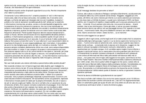 Ovviamente l’ unica definizione che l’ umanità possiede di“ vita” è informazione incensurata, dato che se fosse censurata, non sarebbe vita. E siccome sono abituato, sul fronte del palco ad interargire dal vivo con il pubblico, è proprio il pubblico che nutre le ispirazioni socialterapeutiche dell’ artista per la creatività. L’ informazione incensurata, acustica, sonora o di onde bioelettromagnetiche, sono la proiezione di luce che animano la coscienza, che non è mai individuale ma sempre e solo colettiva. Dunque se abbiamo una società in condizioni relativamente depressa o repressa, queste circostanze sono uno stato d’ animo sulla scala delle frequenze emozionali. Perciò queste frequenze devono essere interpersonali e creare un flusso, devono sincronizzarsi ed è la responsabilità del pilota portare il pubblico, in illuminazione progressiva, e dare al pubblico quello che gli nutre la crescita spirituale; questa per me è vera arte. In piu è l’ articolo 4 della costituzione italiana. Non posso scrivere libri cone“ Io luce nella luce” e poi nascondermi dietro la maschera di chissà chi. Io sono responsabbile per tutti i miei lettori, il mio pubblico da anni è la mia famiglia quasi come dei figli, e ci nutriamo a vicenda. Tutti mi possono sempre contattare direttamente online via e-mail, sono sempre disponibbile per tutte le lettrici e i lettori. Il mio compito è di essere in comunicazione con essi, loro possono sapere tutto su di me, prima tramite le mie opere e, secondo, per poter crescere insieme. Non ho nulla da negare a nessuno, vivo semplicemente la mia vocazione personale che dà senso alla mia vita … la mia informazione incensurata e tutto il mio vissuto nella vita reale si rispecchia nelle mie opere, come stile personale.
