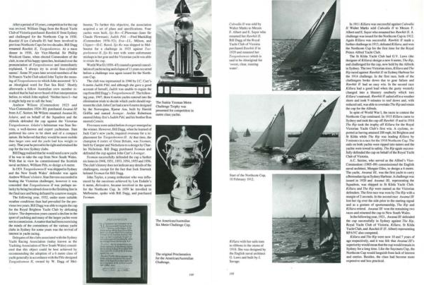 Delegates of theclubs associated with the Sydney Yacht Racing Association ( today known as the Yachring Association of New South Wales ) consid ยท ered that this object could be best achieved by recommending the adoption of a 6 metre class of yacht generally in accordance with the Fife-designed Toogooloowoo II , owned by W . Dagg of Melboume . To funher this objective . the association acquired a set of plans and specifications . Four yachis were bui11 , Sjo Rt > -C. Plowman ( later Sir Claude Plowman ); . fudith Pihl -Fred Mackillop ( Commodore 1938-52 ); Ero-J . L . Milson , and Ctivper- D . C . Ravel . Sjo Ro was shipped to Melbourne for a challenge in 1935 against Toogooloowoo 11 ., Sjo Ro met with some unfortunate mishaps to her gear and the Victorian yacht was able to retain the cup .