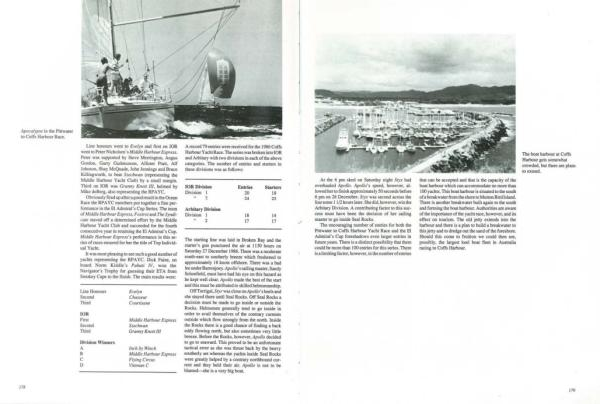 A record 79 entries were received for the 1986 Coffs Harbour Yacht Race . The series was broken inro lOR and Arllitary with two divisions in each of the above categories . The number of entries and starters in these divisions was as follows :