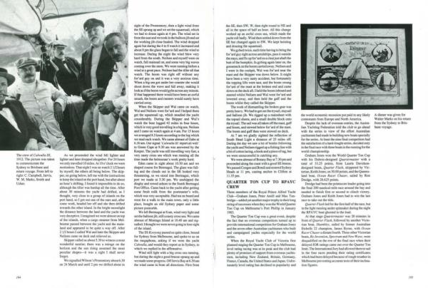 When the Skipper and Wal came on waich , Wal and Neilsen went for ' ard and l helped them gel the squaresail up , wllich steadied the yacht considerably . During the Skipper and Wal ' s waich ! he boat logged 42 miles in four hours , which is very good travelling in a big sea . Neilsen and I came on watch again at 4 am . For LS hours we averaged 8.5 knots according to the log which we read each watch . We came abreast of Oabo at 6.30am . OursigoaJ ' Culwullalll report all well ' to Green Cape a1 9.30 am was answered by lhe Keeper . The yacht was still travelling very fas1 , a very nasty cross sea wllich was running all the time made the helmsman ' s work pretty hard .