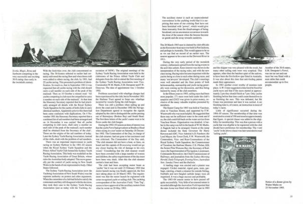 In J 903 another event worthy of mention took place . A . W . Crane suggested a time limit be fixed for yacht races and that if the races started at approximately 2 pm they should finish at 7 pm . Only yachL ~ finishing before that time could count themselves in as finishing the race . This was defeated . but Mr Crane was persistent and later it was carried . A set finishing time is , of course , an instruction in most of today ' s races .