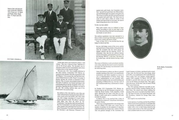 the uniform of tile club shall be a navy blue suit with oxidi ! led buttons bearing the letters RPA YC with a roya . I crown and anchor , and a blue cloth cap with a badge consisting of a royal crown , anchor and laurel wreath . The officers ' uniforms shall differ only from the above by the Commodore ' s having three half-inch gold bands , the Vice-Commodore ' s two half-inch gold bands with n quafler-inch gold band between them , the Rear-Commodore ' s two half -inch gold bands and the Secretary " s and Honorary Treasurer " s two