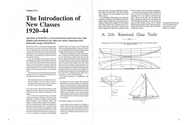 On 16 December 1920 a meeting was told that the Tasmanian yachtsmen were enthusiastic about the original design decided upon and urged that an interstate conference be arranged . The Commodore of the Royal Yacht Club of Tasmania , Owen Tin · ning . visited Sydney and whilst no minute can be found it appears that a decision was made to accept the 21 · ft restricted class for interstate competition .