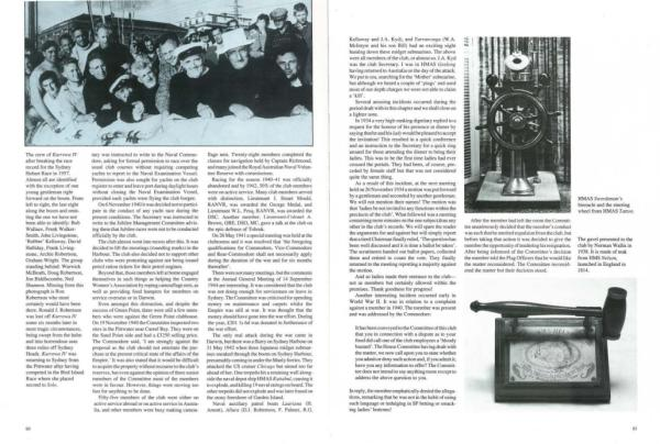 Racing for the season l 940-41 was officially nbiindooed and by 1942 , 30 % of the club members were on active service . Many club members served wilh distinction , Lieutenant J . Stuart Mould . RANVR , was awarded the George Medal , and Lieutenaru W . L . Fesq . RANVR . was awarded the DSC . Another mcmher , l . ie111enon1-rolonel A . Brown , OBE , DSO , MC , gave a talk at the club on 1he epic defence of Tobruk .