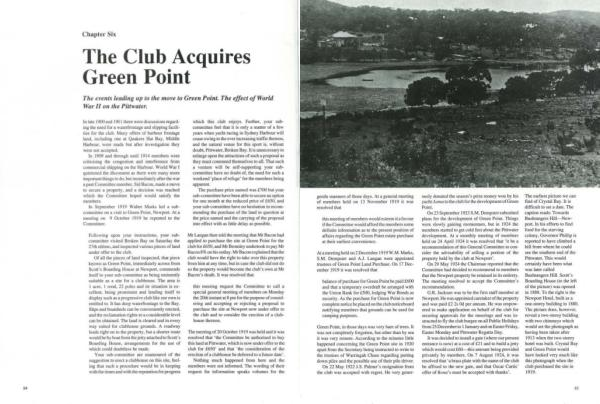 On 23 September 1923 S . M . Dempster submitted plaos for the development of Green Point . Things were slowly gaining momentum , but in 1924 tl1e members started LO gel cold feet about the Pinwater development . At a monthly meeting of members held on 24 April 1924 ii was resolved tlrnt ' it be a recommendation of this General Committee 10 consider lhe advisability of selling a portion of the property held by the club at Newport '.