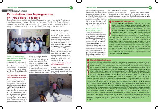 « Ce matin, je me réveille à coté de Saba, dans la chambre qu’ elle partage avec sa sœur. Le papierpeint, les rideaux et les couvertures sont roses avec des motifs de princesses et je suis ensevelie sous 12 000 couvertures. C’ est l’ effervescence: tout le monde se prépare pour aller à l’ école, mais Saba se sent « malade ». Ses parents l’ autorisent à rester. On se rendort puis on déjeune avec la mère de Saba et sa grande sœur comme des reines: des œufs, du fromage, du zaatar, de l’ huile d’ olive, du leban, des olives, du thé, du café.. La mère m’ explique comment elle fait. Elle fabrique elle même tout ça. On parle longtemps du travail que c’ est de s’ occuper d’ une famille. Elles me disent qu’ elles trouvent les Françaises très courageuses, moi, c’ est elles que je trouve courageuses! On sort sur la terrasse pour boire un autre café, accompagné de sucreries. Comme elle va se montrer à l’ extérieur, la mère de Saba met un voile. On discute de tout et de rien, la mère parle un peu anglais, Saba l’ aide parfois, on rigole bien. A un moment, 2 jeep de l’ armée israélienne passent très vite sur la route en bas et entrent dans le village. Les filles se lèvent à demi. Elles m’ expliquent que même si les soldats israéliens viennent pratiquement tous les jours au village, elles ont toujours un petit pic d’ angoisse quand elles les voient passer. Ensuite, Saba me propose de visiter les environs. Je pensais qu’ on allait marcher un peu dans la montagne, mais au lieu de ça, Saba s’ arrête pratiquement dans toutes les maisons dire bonjour. S’ ensuit systématiquement une invitation à prendre un café, du gâteau, des bonbons. On passe comme ça un moment chez sa première voisine, un moment chez sa voisine d’ après, un moment chez sa tante encore après. Notre « promenade » a duré 1h et demi et on a à peine marché 50 m en tout! Bilan du matin: 5 cafés, un petit-dej, 4 « goûters ». Et il est déjà l’ heure d’ aller manger à la Beit. Quand je m’ en vais avec Saba, sa mère me donne un sac de gâteaux et de chips au cas où j’ ai « un petit creux »… J’ ai passé une matinée vraiment parfaite, avec des gens que je ne remercierai jamais assez pour leur gentillesse, leur ouverture d’ esprit et leur générosité. »- Louise- temoignage