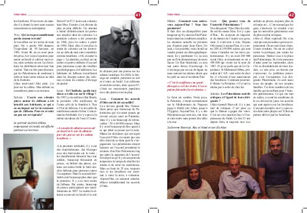 Louis: Que pensez vous de l’ Autorité Palestinienne? Nos dirigeants? Que Dieu les aide. Ils ont les mains liées. Il n’ y a pas d’ État... Ils essayent de négocier et de donner de l’ espoir aux gens, mais il n’ arrivent à rien. Depuis Oslo jusqu’ à aujourd’ hui, il y a entre 200 et 250 000 colons qui sont venus s’ installer sur les terres palestiniennes. Il y en avait 200 000 avant Oslo, et maintenant on est à 450 000 qui vivent sur la terre de 1967. Et je ne parle que de la Cisjordanie. Si Mahmoud Abbas, président de l’ A. P., veut sortir de chez lui, il a besoin d’ une autorisation des Israéliens. Comment pourraitil libérer la Palestine s’ il n’ arrive même pas à sortir de chez lui.