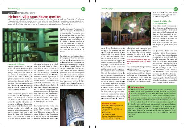 Association d’ Échanges Culturels Hébron France: Adresse: P. O. Box 635, Hébron, Palestine Téléphone / fax:( 00 970 2) 222 48 11 Courriel: info @ hebron-france. org Site: www. hebron-france. org palestiniens sont placardées aux murs. Des drapeaux israéliens flottent au-dessus des toits des maison prises par les colons et il y a des militaires à tous les coins de rue.